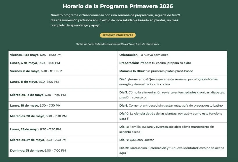 El Reto Salud a Base De Plantas es un programa virtual divertido y de apoyo, diseñado para ayudarte a realizar la transición hacia un estilo de vida basado en alimentos integrales de origen vegetal. Con la guía de expertos y una comunidad de compañeros, desarrollarás hábitos saludables duraderos; ¡todo lo que necesitas es una conexión a internet y la disposición para intentarlo